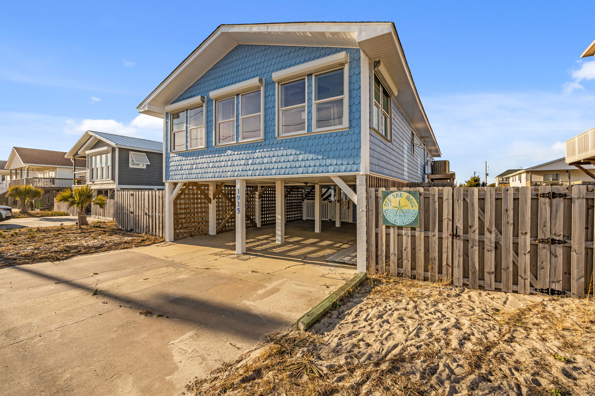 Just steps from the sand and positioned on the second row of Topsail Island, this thoughtfully updated coastal retreat offers ocean views, versatile outdoor living, and the rare opportunity to pair it with an oceanfront lot directly across the street. Inside, the home opens to a bright, open-concept layout where the living room, dining area, and ocean-side sunroom flow seamlessly together, all finished with 7'' luxury vinyl plank flooring designed for durability and easy coastal living. Abundant natural light and sightlines toward the Atlantic create an inviting space for everyday living or entertaining after a day at the beach. The kitchen blends style and function with granite countertops, a GE flat-top 4-burner range, and a distinctive barn-door pantry. A 6.5-foot pendant-lit breakfast bar provides comfortable seating for casual meals, morning coffee, or gathering with guests. The primary suite is a relaxing retreat featuring 8' smooth ceilings, 2¼'' window trim, 2'' faux wood blinds, and a Hunter ceiling fan. The en-suite bath is well-appointed with a granite-topped single vanity, Allen + Roth fixtures, and a glass walk-in shower highlighted by a 10'' rain shower head. Two guest bedrooms share a spacious guest bath with a 16' x 16' tiled walk-in shower and a granite single vanity, offering comfort and convenience for family or visitors. Outdoor living is a standout feature of this home. Covered parking provides ample space below, along with two ground-level storage rooms for beach gear and equipment. A fenced yard creates a private setting, while the ground-level hangout area with 5.5'' Trex decking is perfect for entertaining. Above, the elevated rear deck overlooks the home, established dune, and Topsail Island's award-winning beaches — an ideal perch to check the surf, enjoy ocean breezes, and take in memorable sunrises and sunsets. Additional features include an outdoor hot-and-cold shower and hurricane shutters.